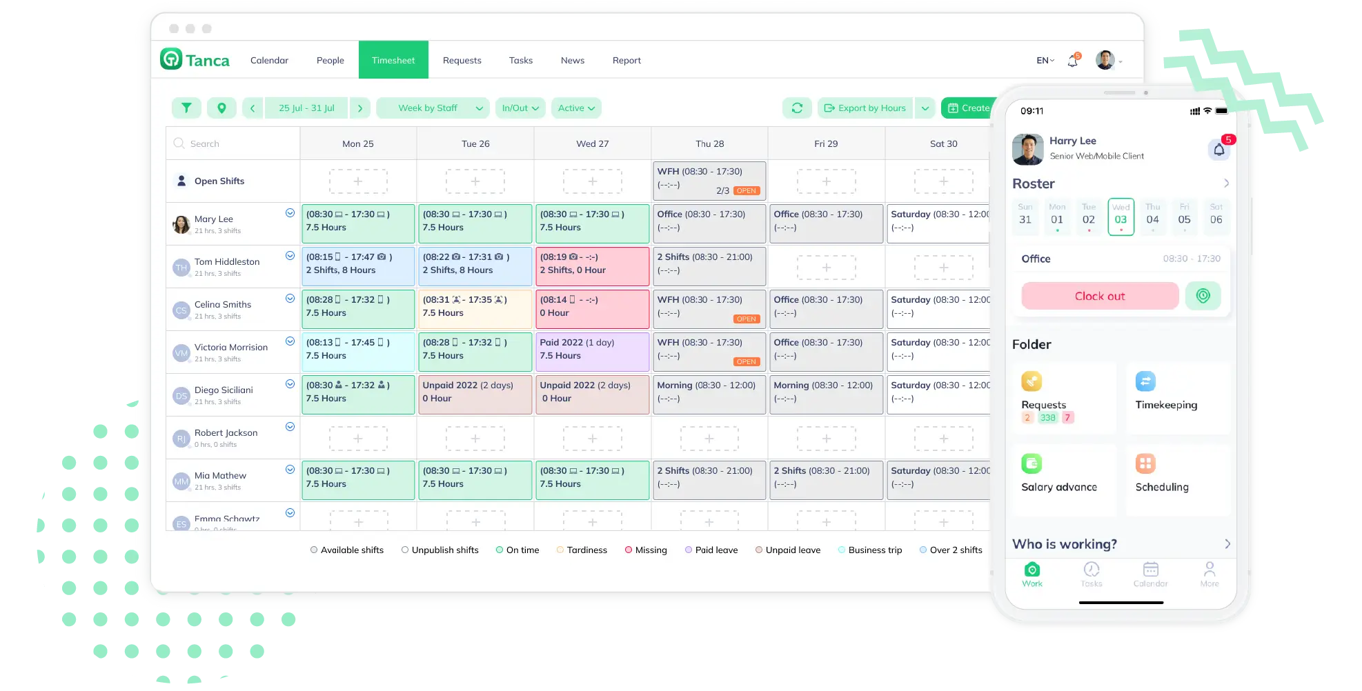 Sử dụng ứng dụng dành cho thiết bị di động của Tanca chấm công dễ dàng và tính giờ nghỉ ngơi. Phần mềm chấm công cũng giúp tính lương nhanh chóng và chính xác theo thời gian thực. |