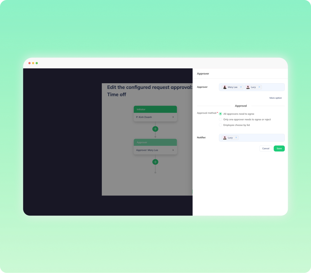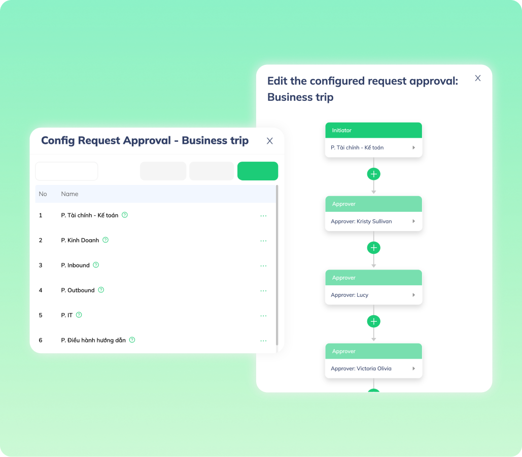 Thiết lập người phê duyệt theo chức danh, phòng ban, lựa chọn hoặc đơn vị tổ chức.