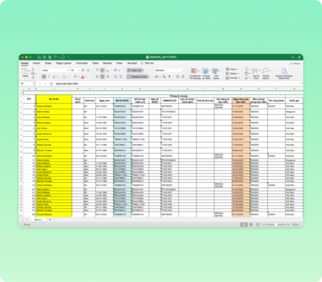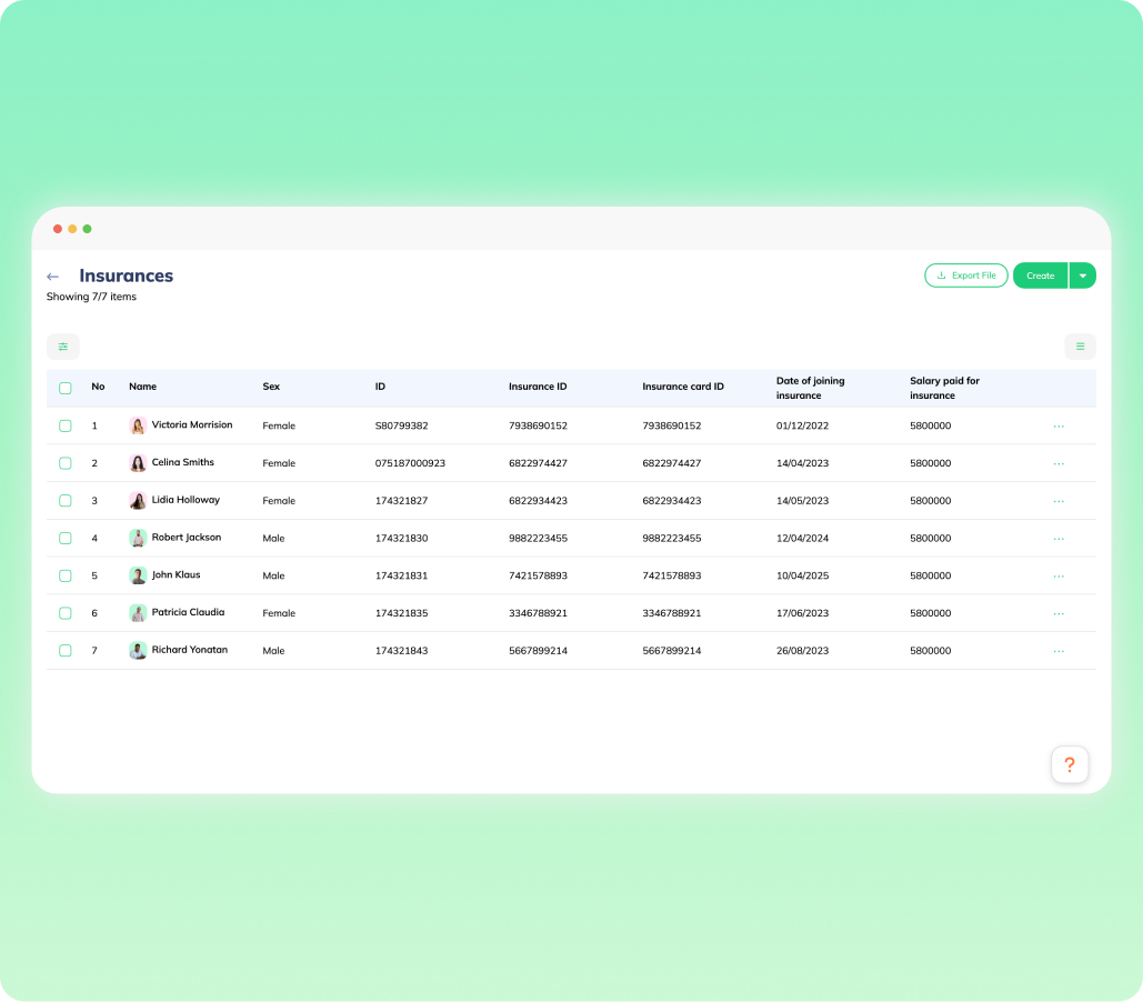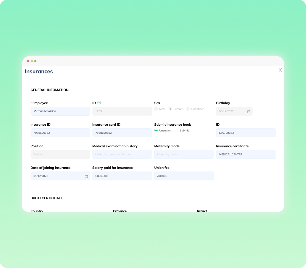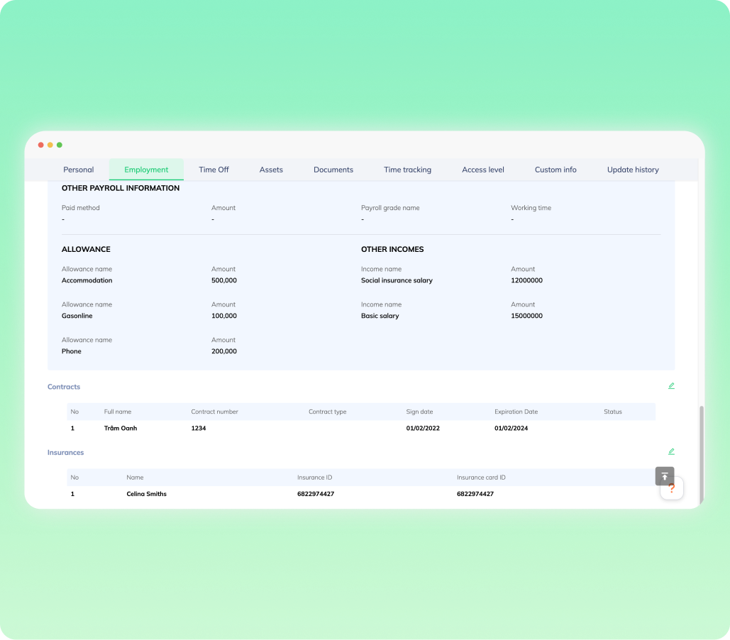 Quản lý thông tin bảo hiểm cho từng hồ sơ nhân viên.
