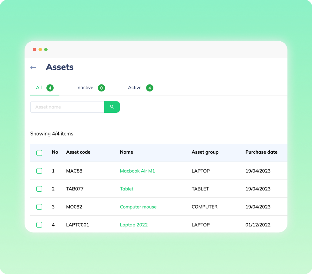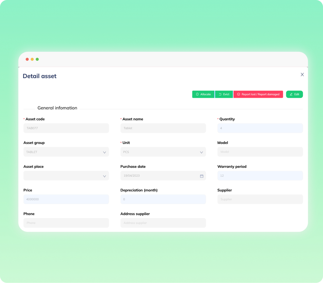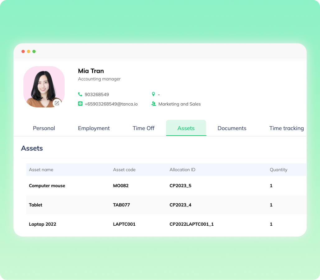 Tanca cho phép theo dõi chi tiết các tài sản được phân bổ cho nhân viên, giám sát trạng thái của chúng và quản lý quy trình phân bổ hoặc thu hồi một cách hiệu quả. Điều này đảm bảo rằng các nguồn lực được sử dụng tối ưu và được ghi nhận đầy đủ.