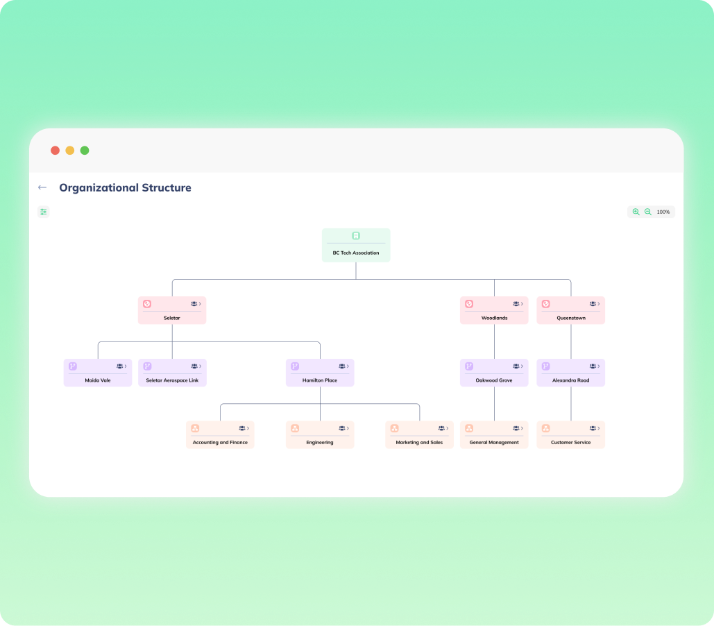 Các mô hình kinh doanh với nhiều ngành nghề, dịch vụ và địa điểm có thể dễ dàng thiết lập biểu đồ cơ cấu tổ chức.