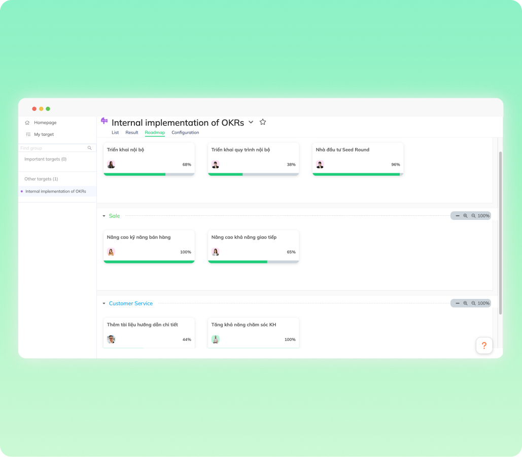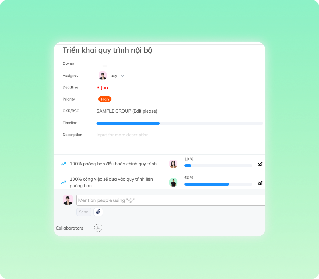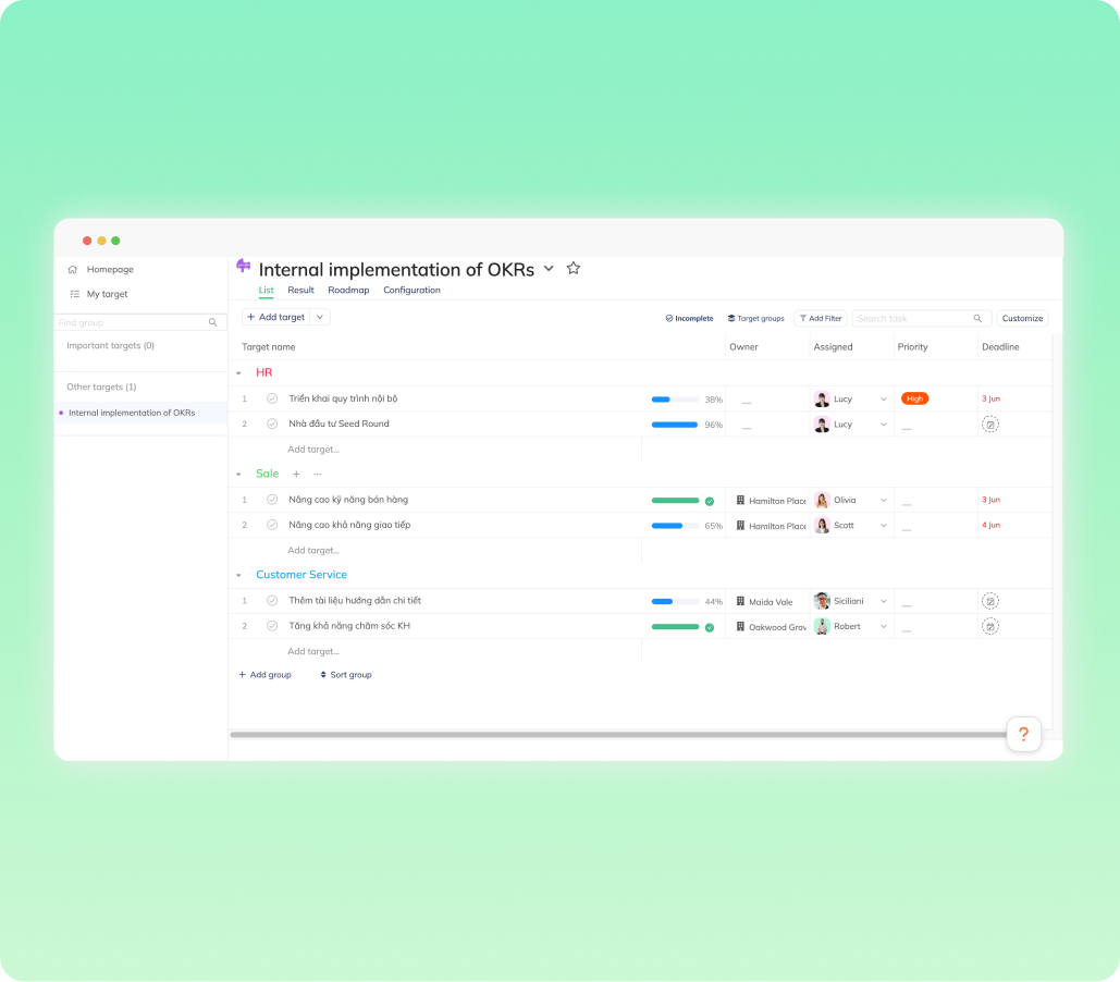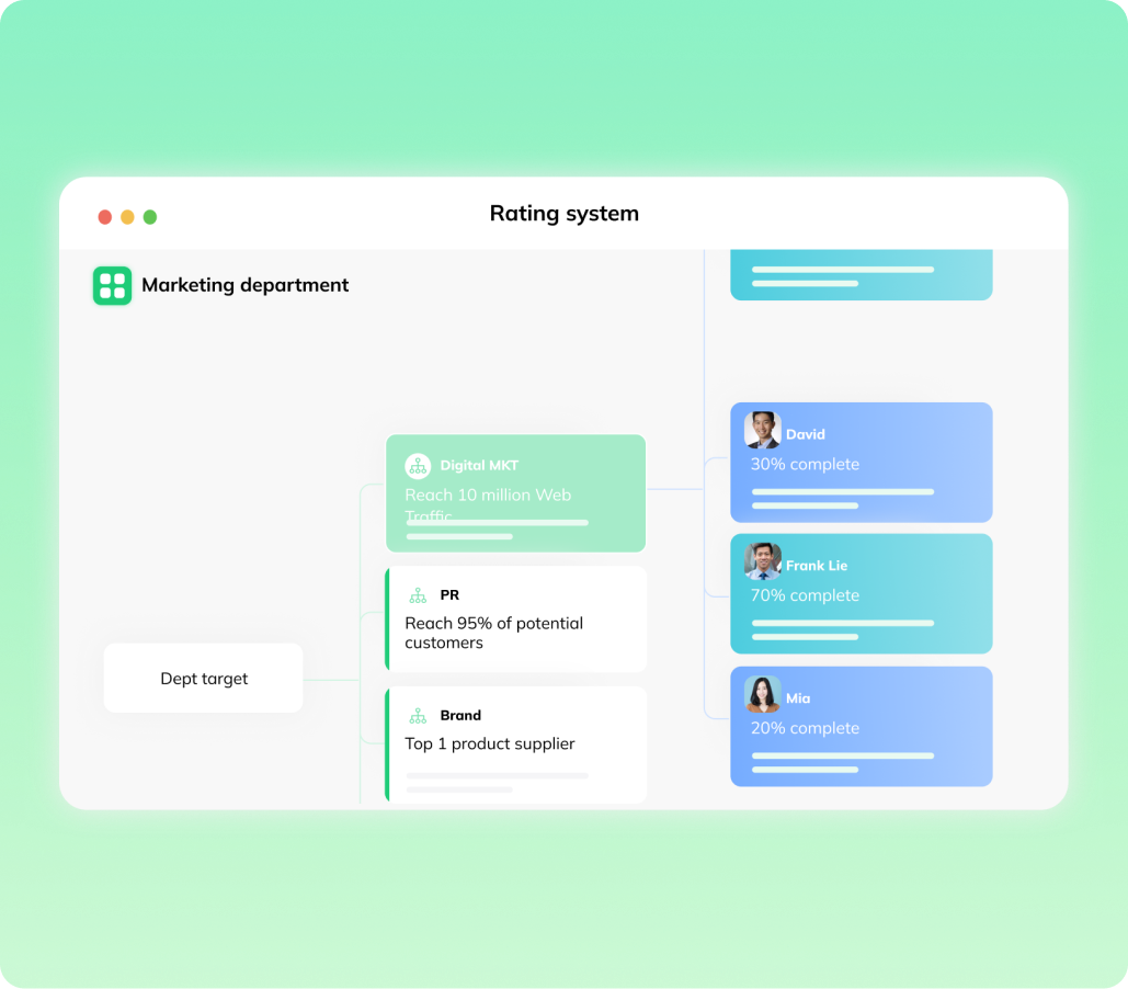 Thiết lập và theo dõi OKR để đảm bảo tất cả các thành viên trong nhóm đều đồng bộ với các mục tiêu và chỉ tiêu của công ty, thúc đẩy hiệu suất và sự phát triển.