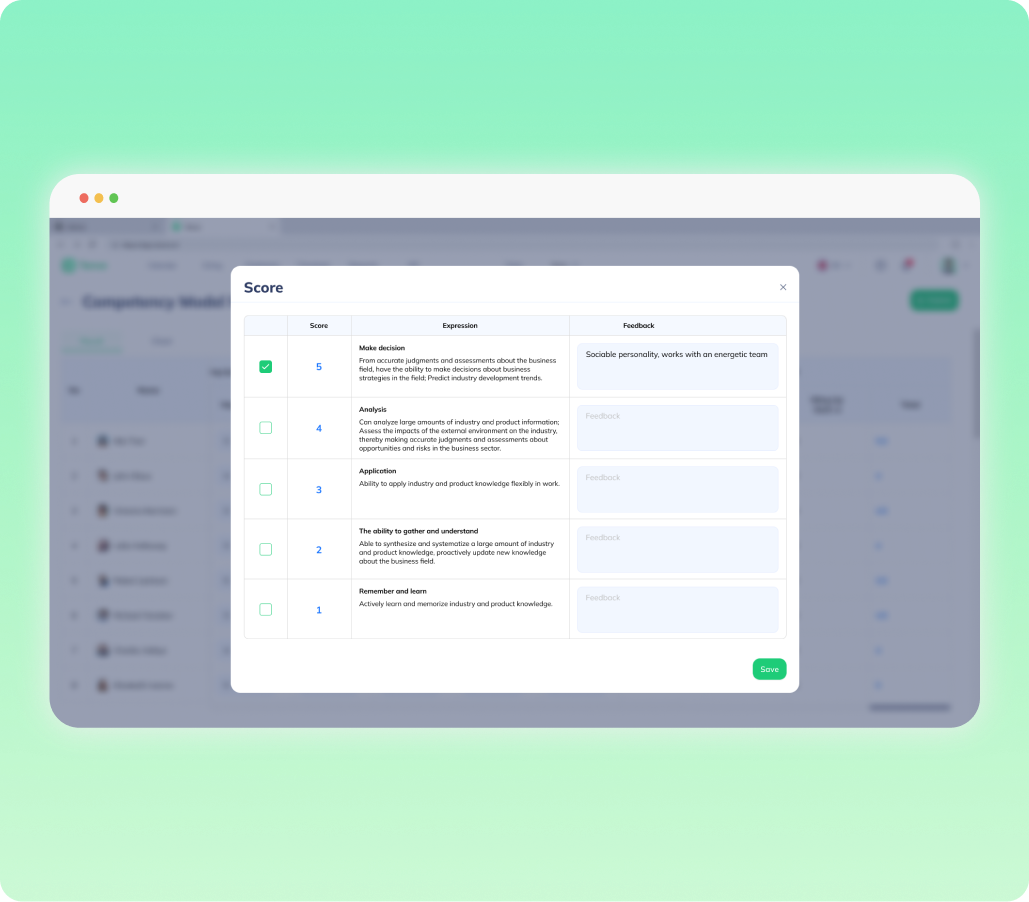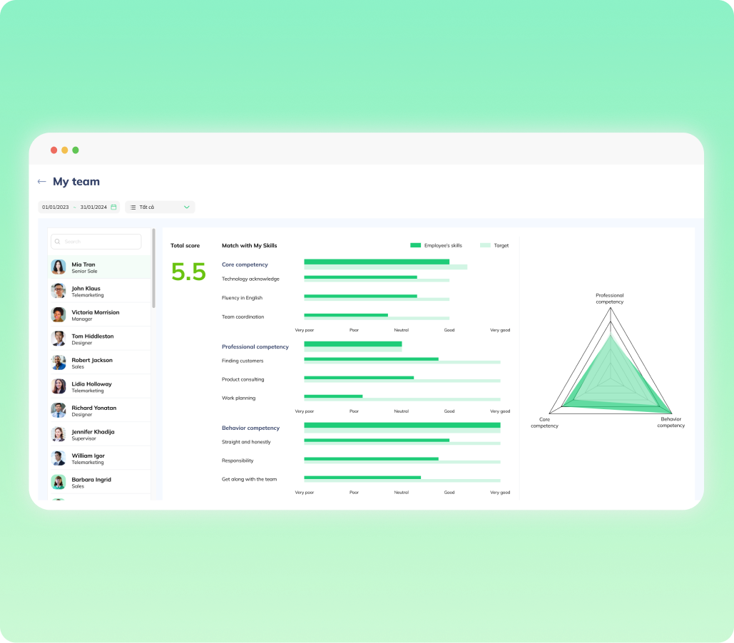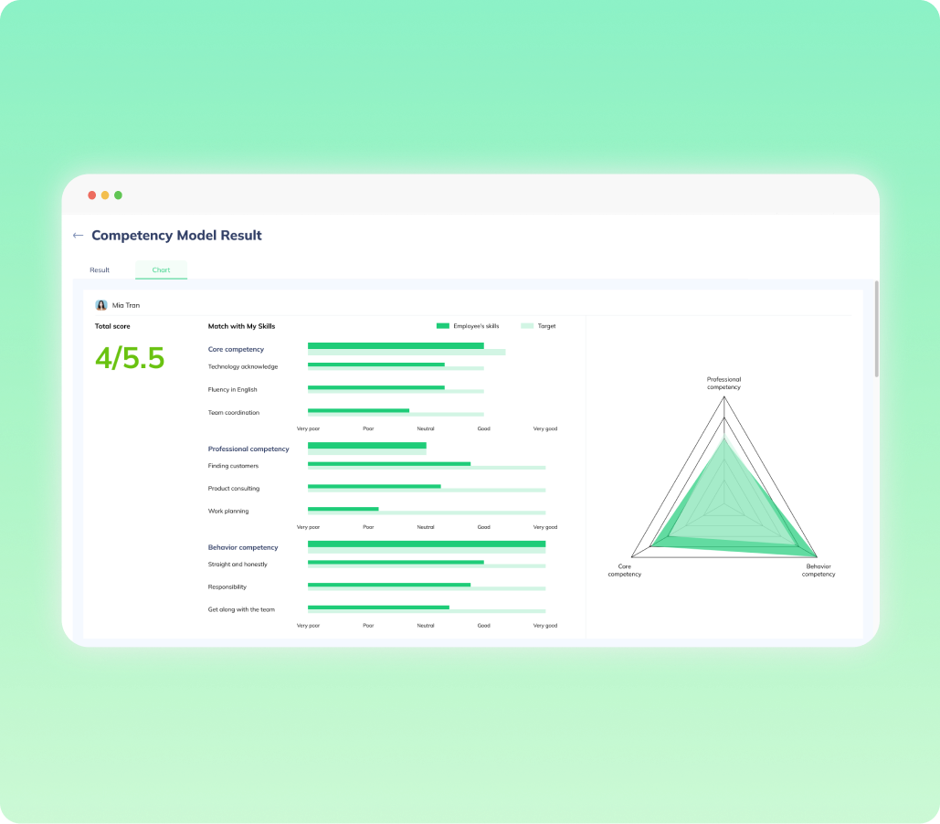 Liên kết năng lực với mục tiêu công việc và đánh giá hiệu suất. Tạo ra một hệ thống đánh giá công bằng và minh bạch, thúc đẩy hiệu suất cao.