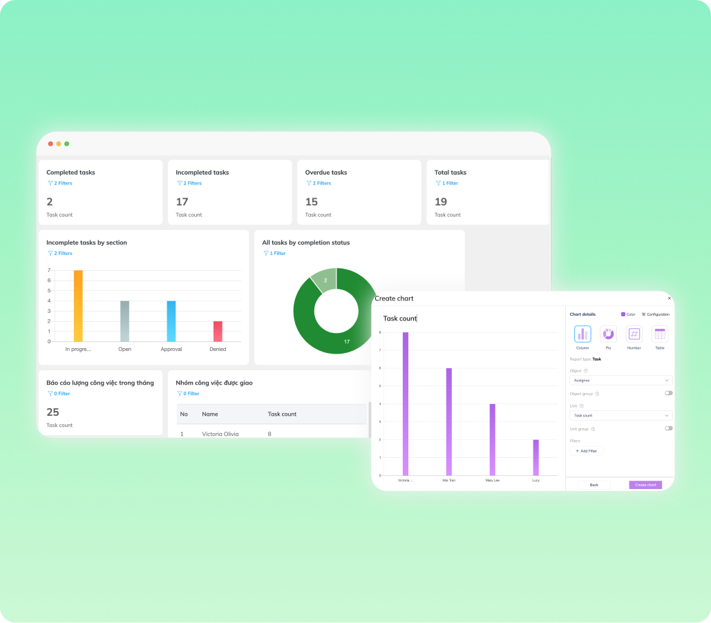Giao nhiệm vụ, tạo bản tóm tắt dự án, và thêm tài nguyên để mọi người cùng hiểu rõ.