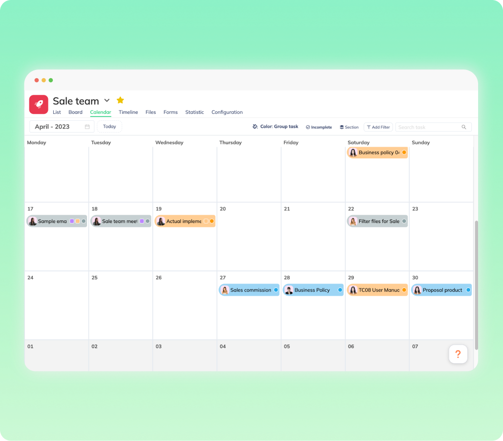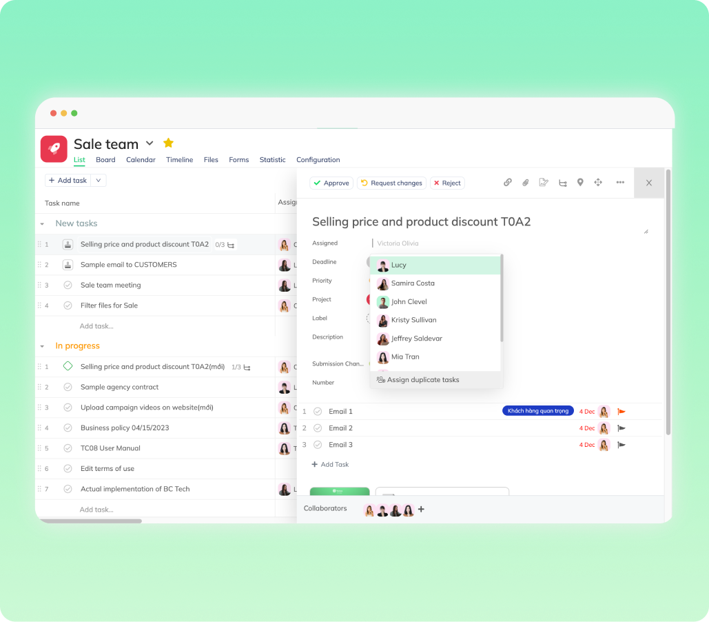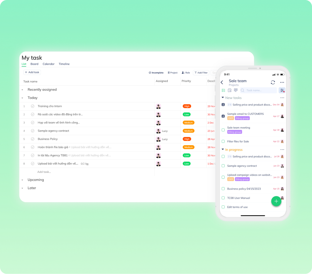 Phần mềm quản lý công việc giúp bạn quản lý tất cả các công việc trong công ty bao gồm các công việc của phòng ban, dự án, công việc liên phòng ban, v.v. Phần mềm cho phép cộng tác thuận tiện và chi tiết trong môi trường làm việc từ xa. Các cá nhân có thể quản lý nhiều công việc qua các dự án, phòng ban, và dòng thời gian.