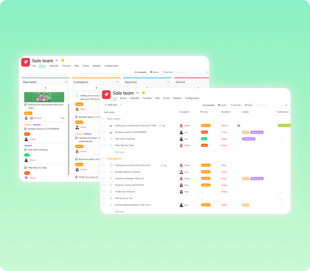 Hiển thị đa dạng dưới dạng Danh sách, Kanban, Timeline, hoặc Biểu đồ Gantt.